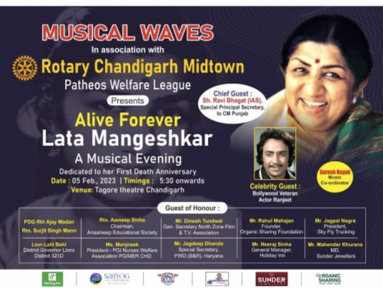 समय रहेगा सांय साढ़े पांच बजे से।यह कार्यक्रम म्यूजिकल वेव्स द्वारा रोटरी चण्डीगढ़ मिडटाउन व पैथीओज़ वेलफेयर लीग के सहयोग से किया जा रहा है जिसमें सेलिब्रिटी गेस्ट बॉलीवुड एक्टर रंजीत होंगे जबकि मुख्य अतिथि के तौर पर पंजाब के मुख्यमंत्री के स्पेशल प्रिंसिपल सेक्रेट्री रवि भगत, आईएएस, पधारेंगे। कार्यक्रम में पंजाब, हरियाणा व चण्डीगढ़ से लगभग 15 गायक-गायिकाएं अपनी प्रस्तुतियां देंगे।जानकारी देते हुए रोटरी क्लब मिडटाउन की तरफ से वरिष्ठ अधिवक्ता सलिल बाली व म्यूज़िकल वेव्स की ओर से परम चंदेल, राजेश उल्फत व विकास सिंगला ने जानकारी देते हुए