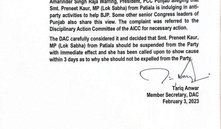 अखिल भारतीय कांग्रेस की अनुशासनात्मक एक्शन कमेटी की तरफ से परनीत को एक कारण बताओ नोटिस भी जारी किया गया है। जिसमें परनीत से तीन दिनों के अंदर जवाब मांगा गया है कि उनके खिलाफ पार्टी से निलंबन की कार्रवाई क्यों न की जाए।उल्लेखनीय है कि परनीत कौर पिछले साल हुए पंजाब विधानसभा चुनावों के समय से खुलकर कांग्रेस से नाता तोड़कर अपनी अलग पार्टी पीएलसी बनाने वाले अपने पति कैप्टन अमरिंदर सिंह के हक में चुनाव मैदान में उतरी थीं।